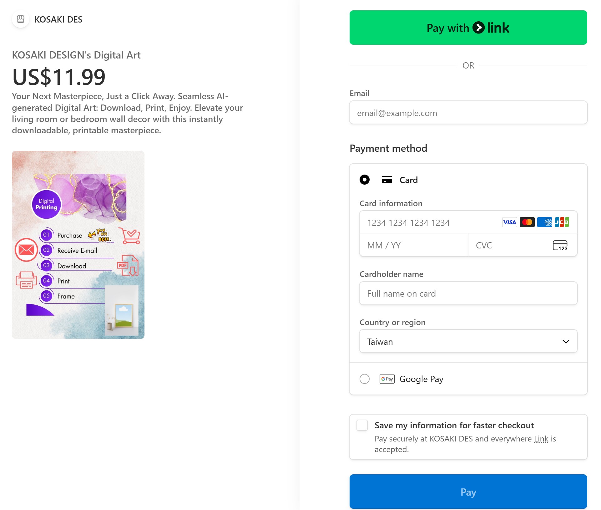Click the "BUY" button on your favorite artwork to proceed to the Stripe payment page. Simply enter your email address and payment details. A confirmation email will be sent to you immediately.