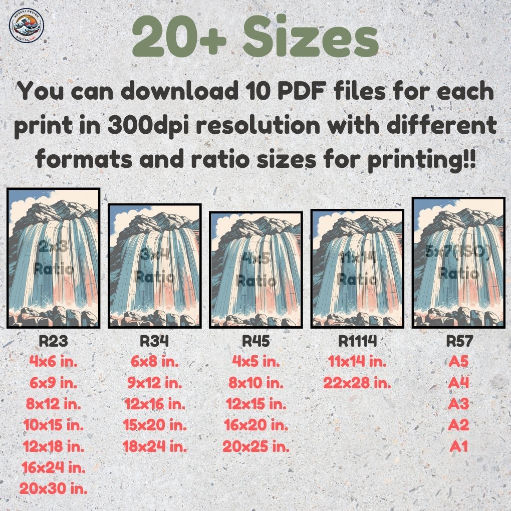 You'll get high-quality (300dpi) files that can be printed in over 20 different sizes. Here's a list of the included ratios and their corresponding print sizes. If you require a specific size or have any inquiries about sizes, printing, or any other matter, simply send us a message. We'll respond as soon as possible to help you.