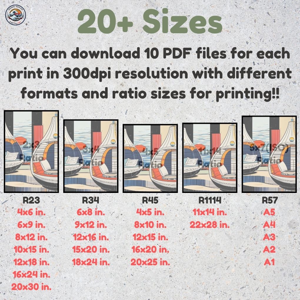 You'll get high-quality (300dpi) files that can be printed in over 20 different sizes. Here's a list of the included ratios and their corresponding print sizes. If you require a specific size or have any inquiries about sizes, printing, or any other matter, simply send us a message. We'll respond as soon as possible to help you.