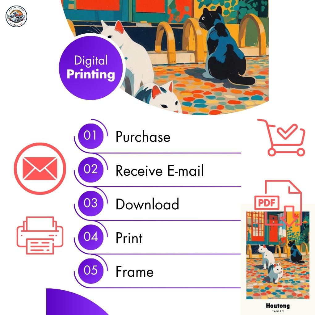 Walls dead? Download Taiwan Houtong Cat Village Art. Bedroom, office, living room, kitchen – blast them with vibrant, instant art. Upgrade NOW. Enjoy this AI-generated product!!