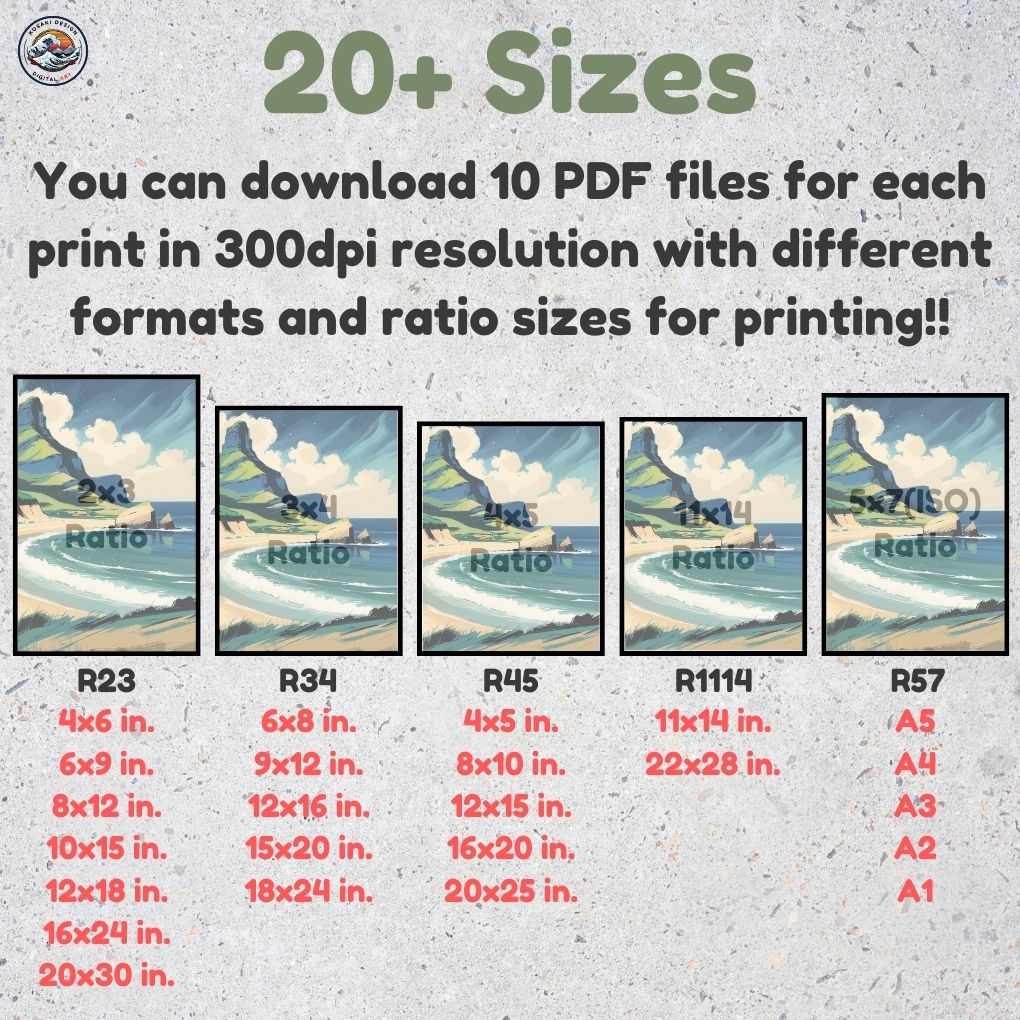 You'll get high-quality (300dpi) files that can be printed in over 20 different sizes. Here's a list of the included ratios and their corresponding print sizes. If you require a specific size or have any inquiries about sizes, printing, or any other matter, simply send us a message. We'll respond as soon as possible to help you.