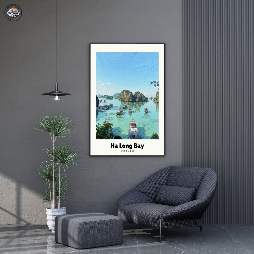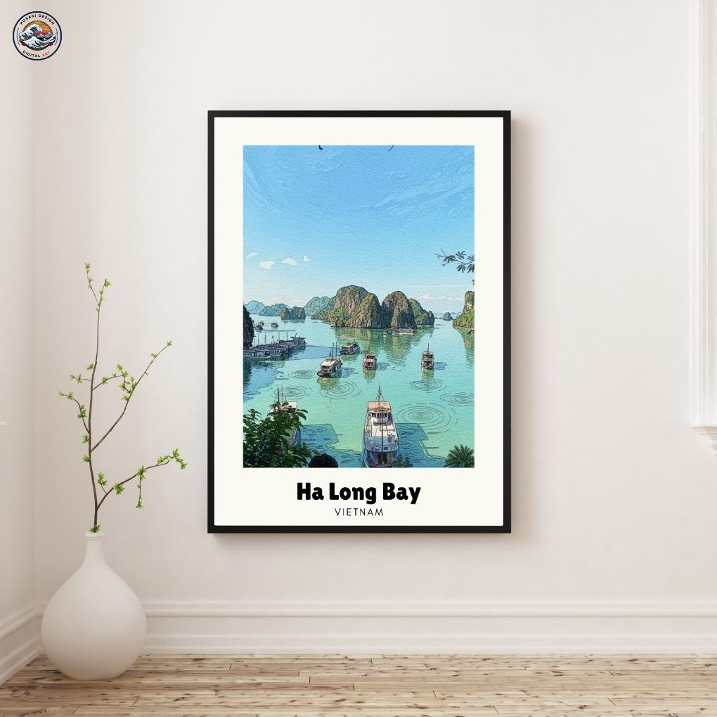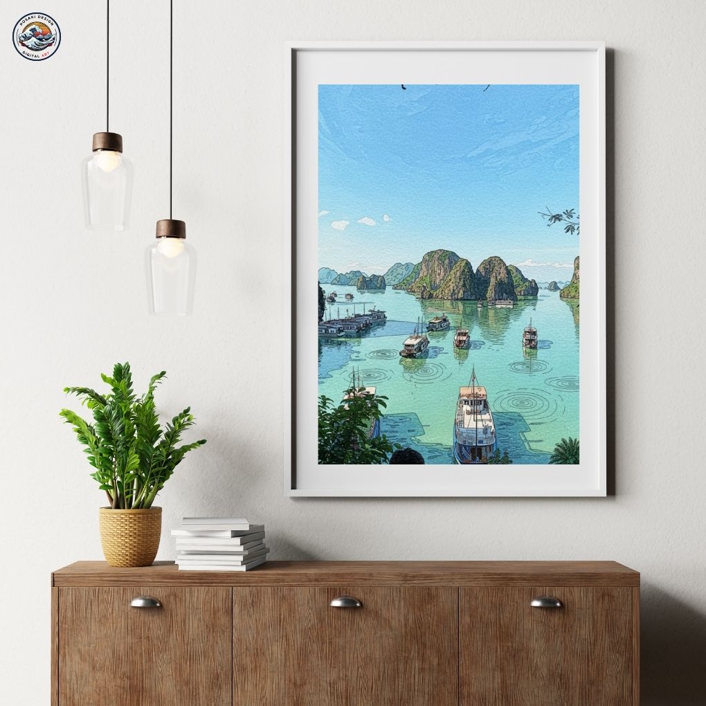 Walls dead? Download Vietnam Ha Long Bay Art. Bedroom, office, living room, kitchen – blast them with vibrant, instant art. Upgrade NOW. Enjoy this AI-generated product!!