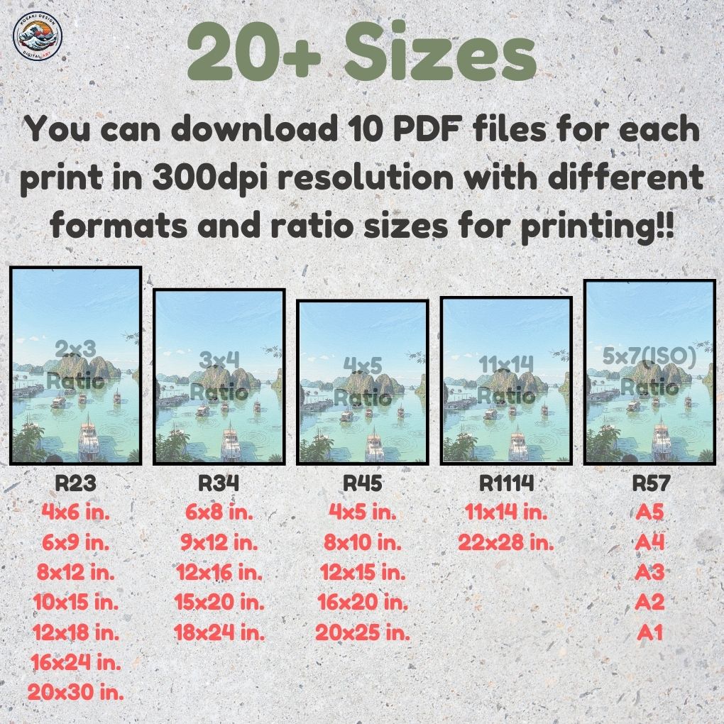 You'll get high-quality (300dpi) files that can be printed in over 20 different sizes. Here's a list of the included ratios and their corresponding print sizes. If you require a specific size or have any inquiries about sizes, printing, or any other matter, simply send us a message. We'll respond as soon as possible to help you.