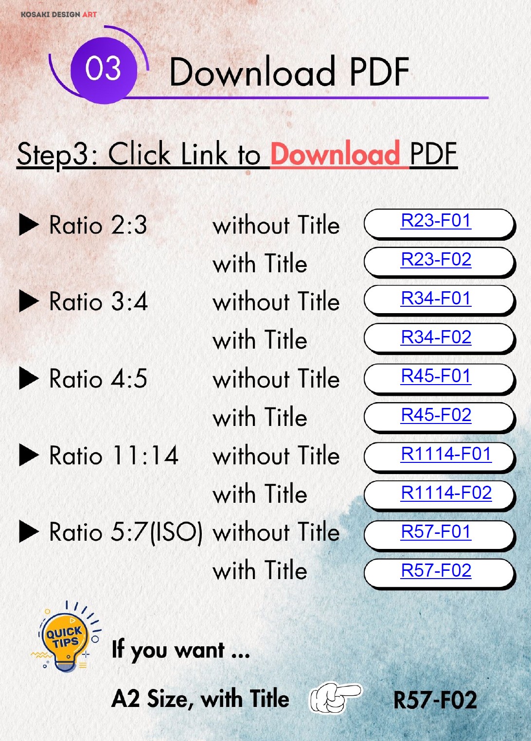 ● Example: If you want an A2 Size print with the Title, you would click R57-F02.