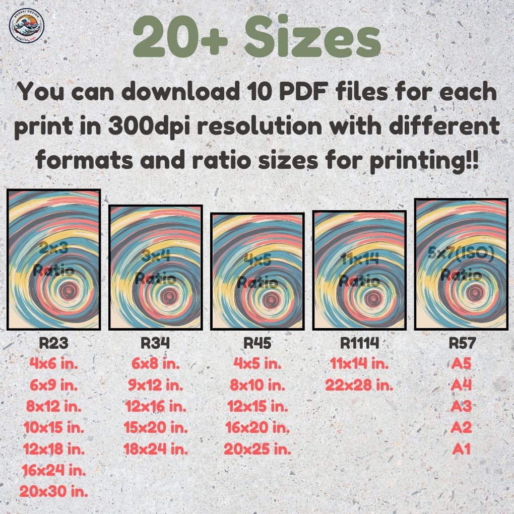 You'll get high-quality (300dpi) files that can be printed in over 20 different sizes. Here's a list of the included ratios and their corresponding print sizes. If you require a specific size or have any inquiries about sizes, printing, or any other matter, simply send us a message. We'll respond as soon as possible to help you.