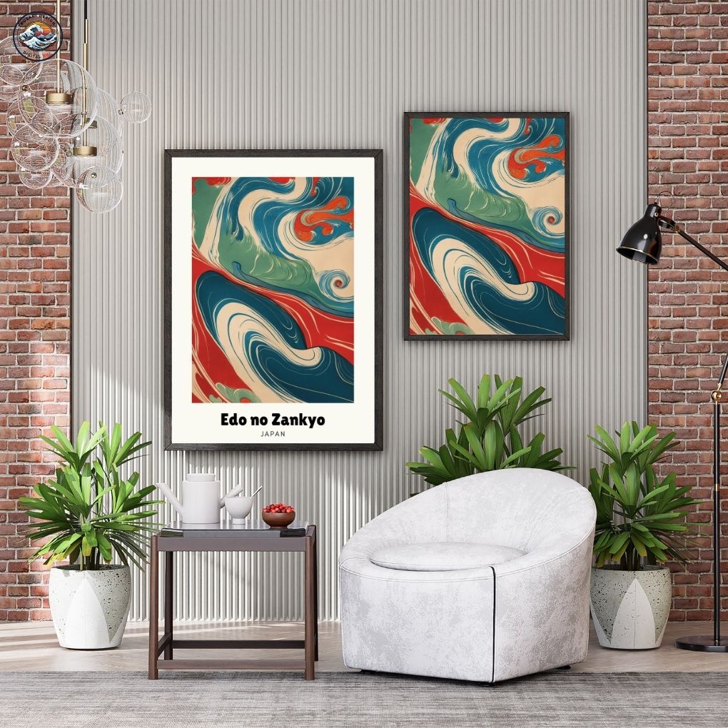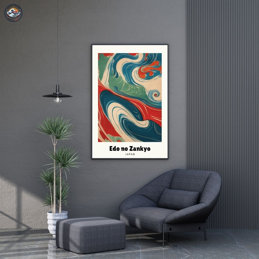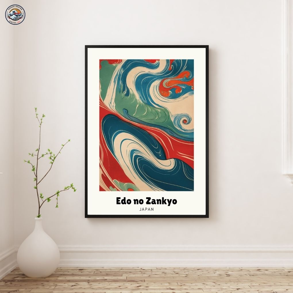 Echoes of Edo(江戸の残響, Edo no Zankyō) refers to the enduring spirit and aesthetic of Japans Edo period. The vibrant, stylized waves and flowing lines are a modern memory of Ukiyo-e art. It is a visual journey through history, where a river of colors carries the past into the present.