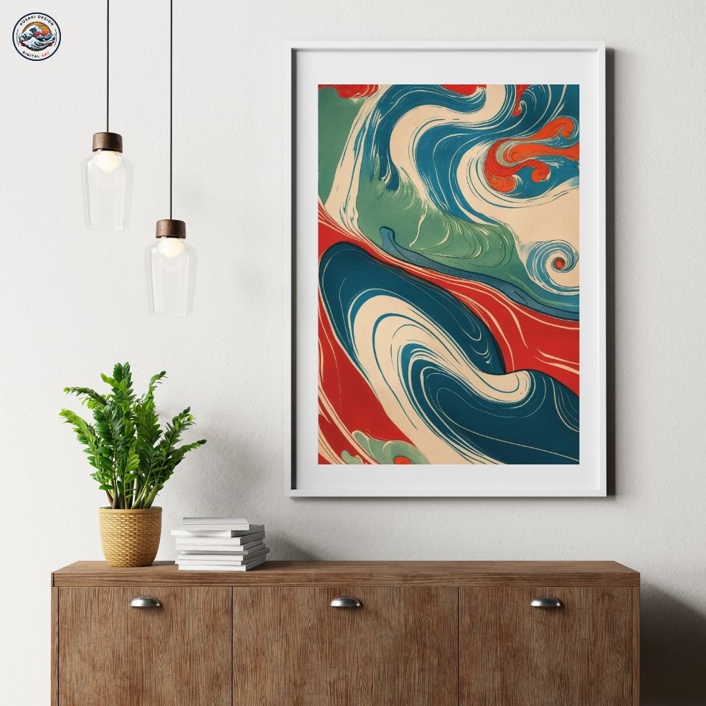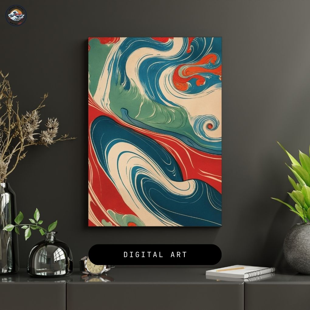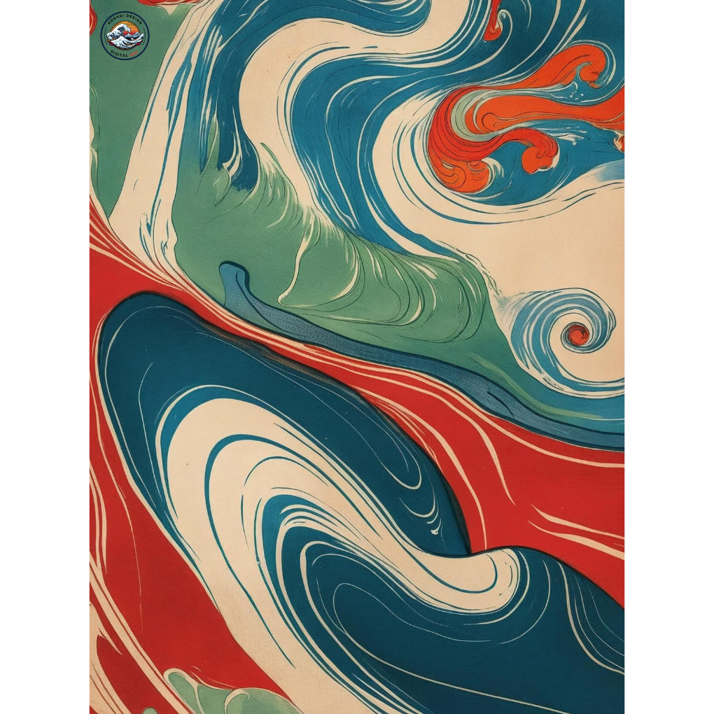 Echoes of Edo(江戸の残響, Edo no Zankyō) refers to the enduring spirit and aesthetic of Japans Edo period. The vibrant, stylized waves and flowing lines are a modern memory of Ukiyo-e art. It is a visual journey through history, where a river of colors carries the past into the present.