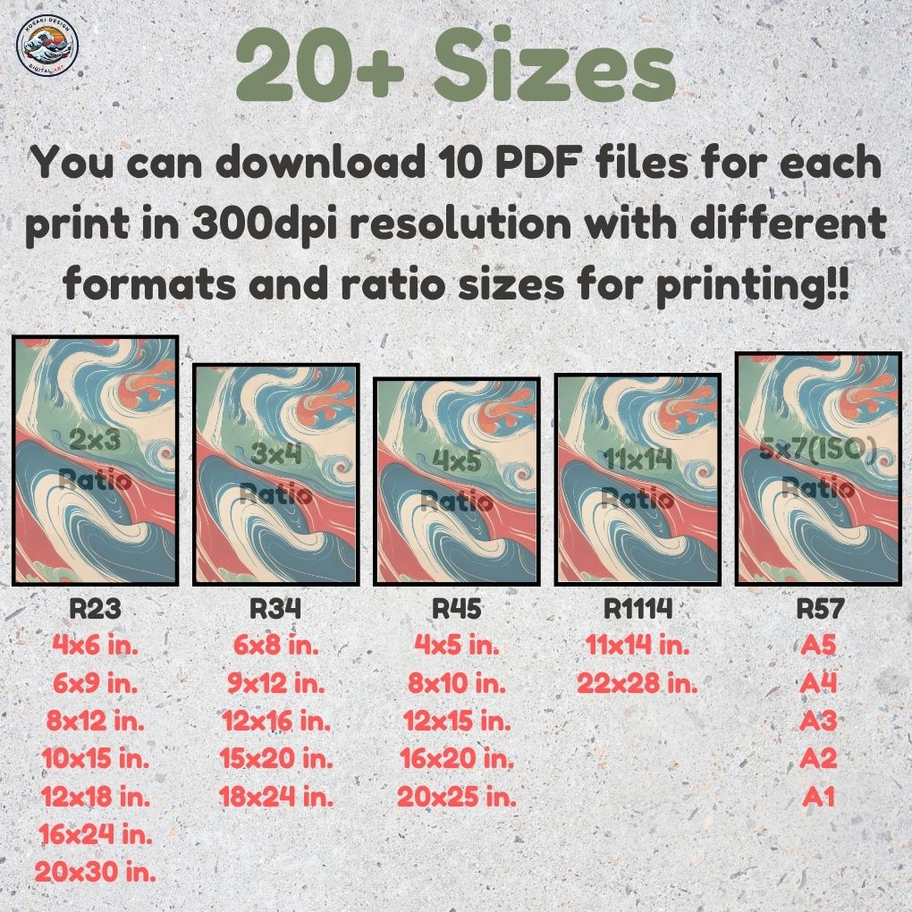 You'll get high-quality (300dpi) files that can be printed in over 20 different sizes. Here's a list of the included ratios and their corresponding print sizes. If you require a specific size or have any inquiries about sizes, printing, or any other matter, simply send us a message. We'll respond as soon as possible to help you.