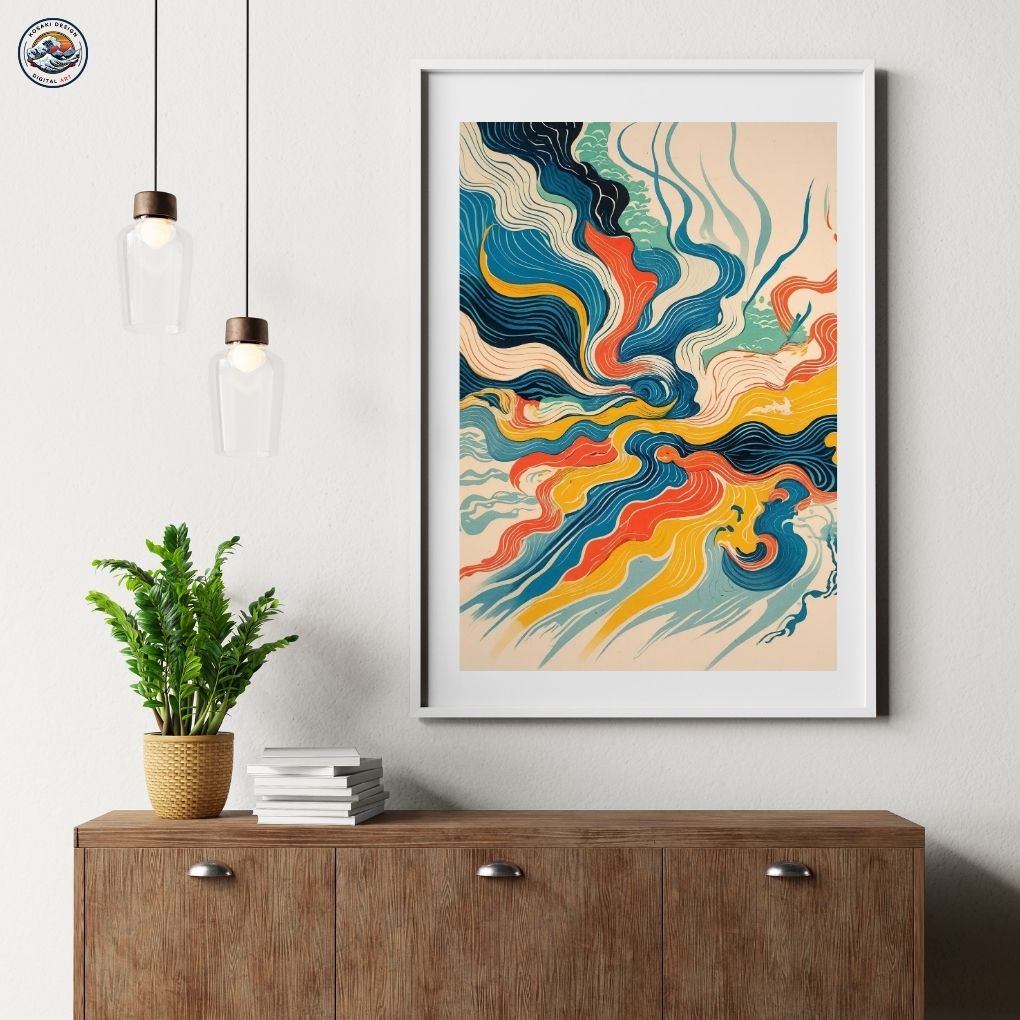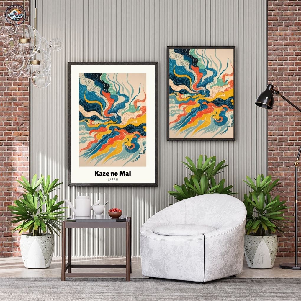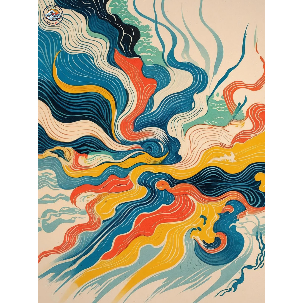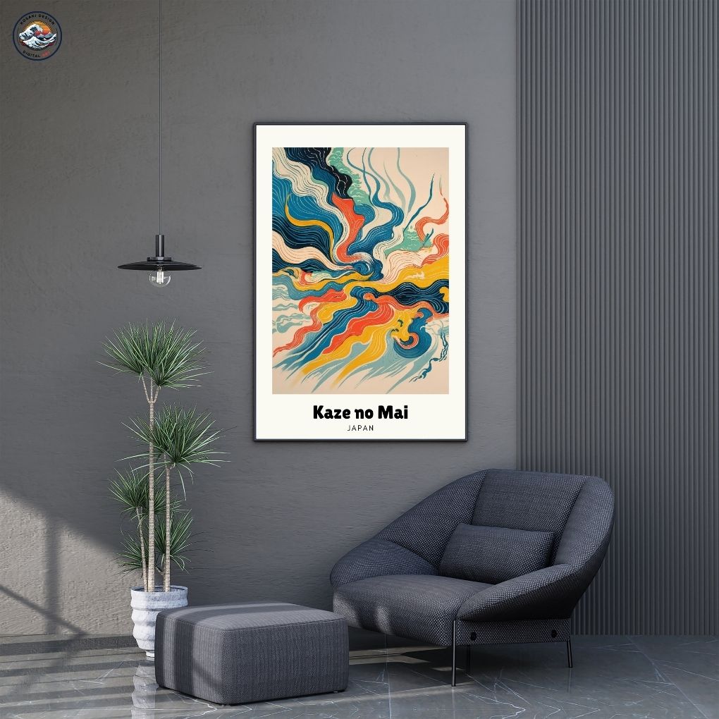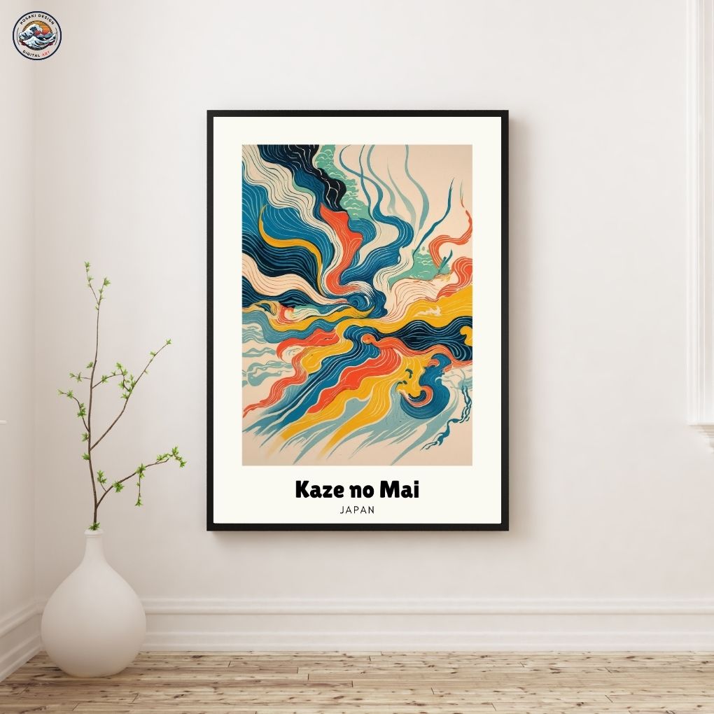 Wind Dance, or Kaze no Mai, captures the invisible yet powerful rhythm of the air. The flowing lines and dynamic colors appear to be caught in an elegant, swirling motion. It is a visual representation of natures graceful and untamed power, a dance where wind and water become one.