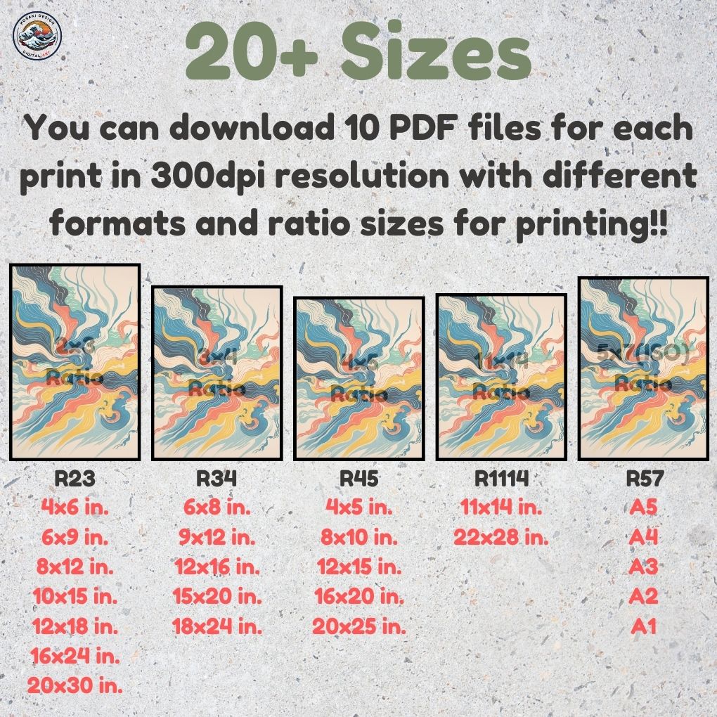 Your digital art journey begins with a single PDF! Inside, you'll find 10 direct links to download high-quality 300dpi PDF files of your artwork. Each file is a versatile resource, containing various aspect ratios that enable you to print your chosen piece in over 20 different dimensions.