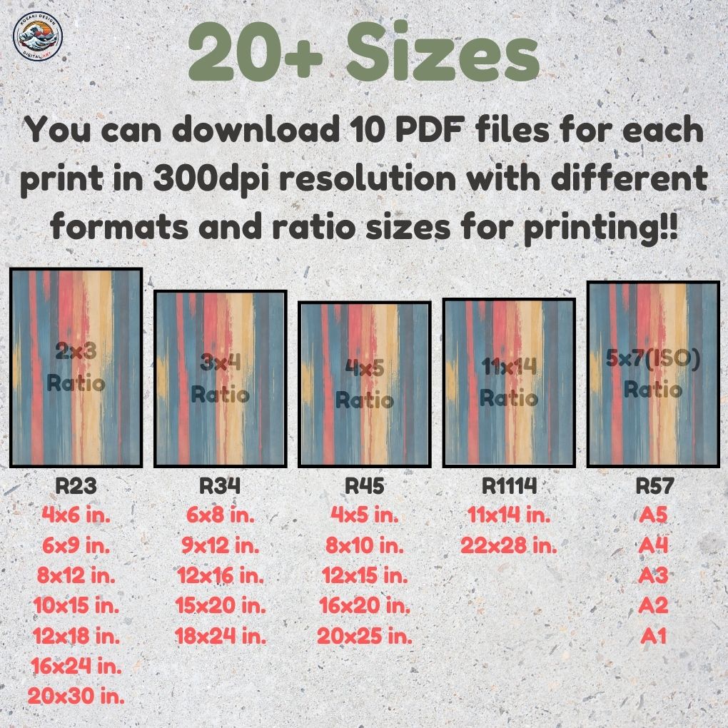 You'll get high-quality (300dpi) files that can be printed in over 20 different sizes. Here's a list of the included ratios and their corresponding print sizes. If you require a specific size or have any inquiries about sizes, printing, or any other matter, simply send us a message. We'll respond as soon as possible to help you.