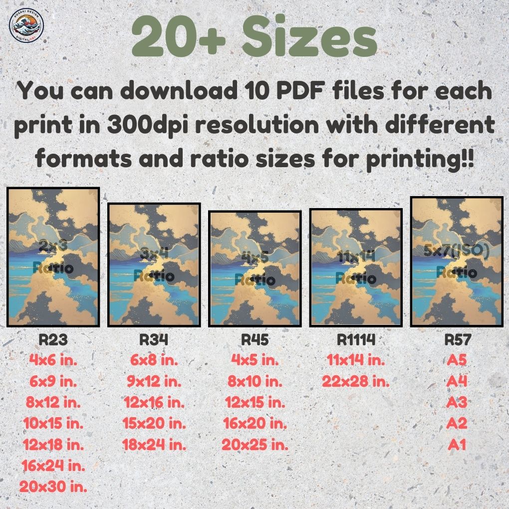 You'll get high-quality (300dpi) files that can be printed in over 20 different sizes. Here's a list of the included ratios and their corresponding print sizes. If you require a specific size or have any inquiries about sizes, printing, or any other matter, simply send us a message. We'll respond as soon as possible to help you.