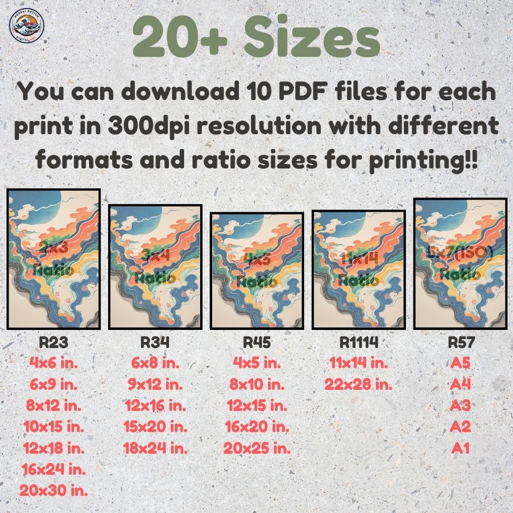 You'll get high-quality (300dpi) files that can be printed in over 20 different sizes. Here's a list of the included ratios and their corresponding print sizes. If you require a specific size or have any inquiries about sizes, printing, or any other matter, simply send us a message. We'll respond as soon as possible to help you.