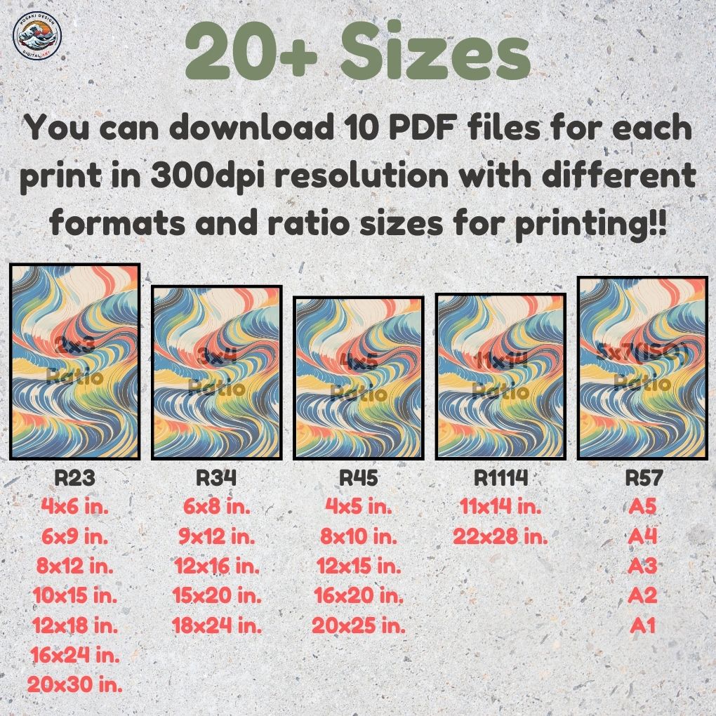 Your digital art journey begins with a single PDF! Inside, you'll find 10 direct links to download high-quality 300dpi PDF files of your artwork. Each file is a versatile resource, containing various aspect ratios that enable you to print your chosen piece in over 20 different dimensions.