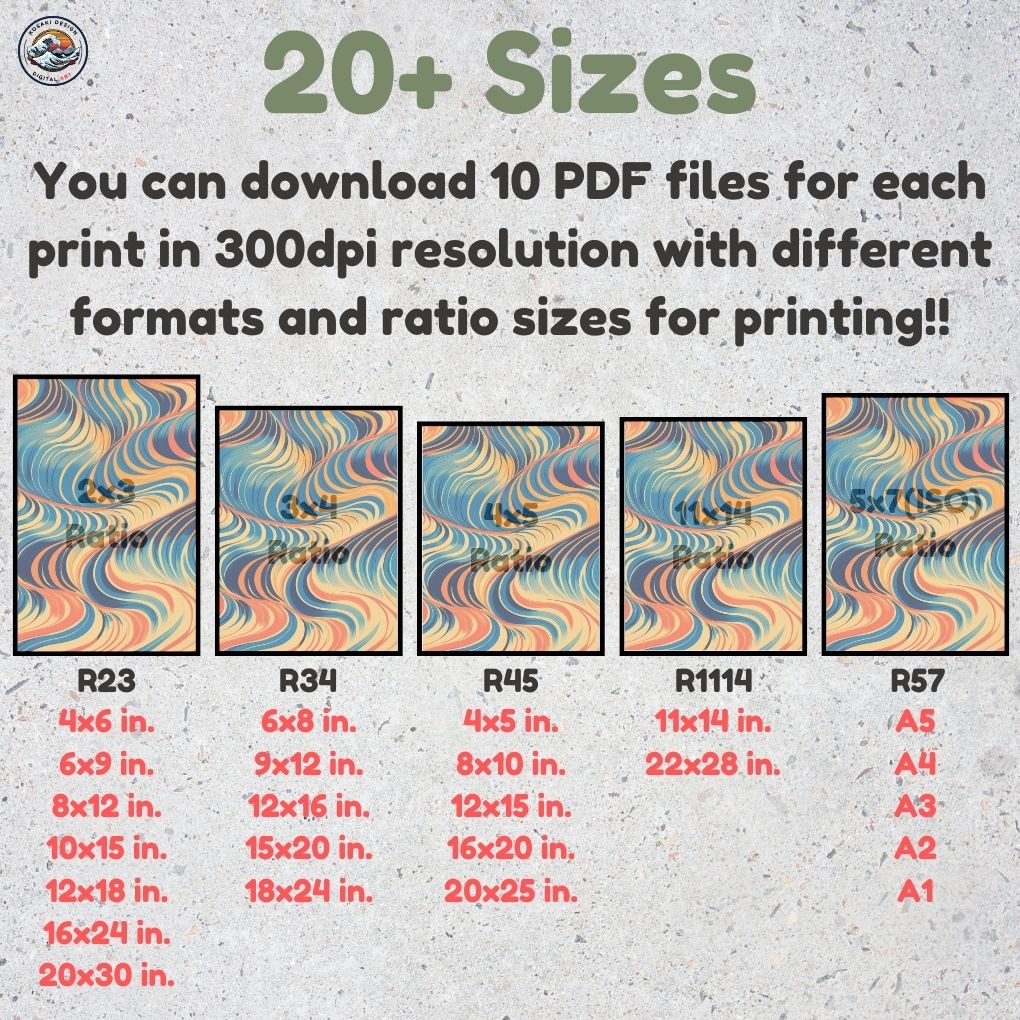 Your digital art journey begins with a single PDF! Inside, you'll find 10 direct links to download high-quality 300dpi PDF files of your artwork. Each file is a versatile resource, containing various aspect ratios that enable you to print your chosen piece in over 20 different dimensions.