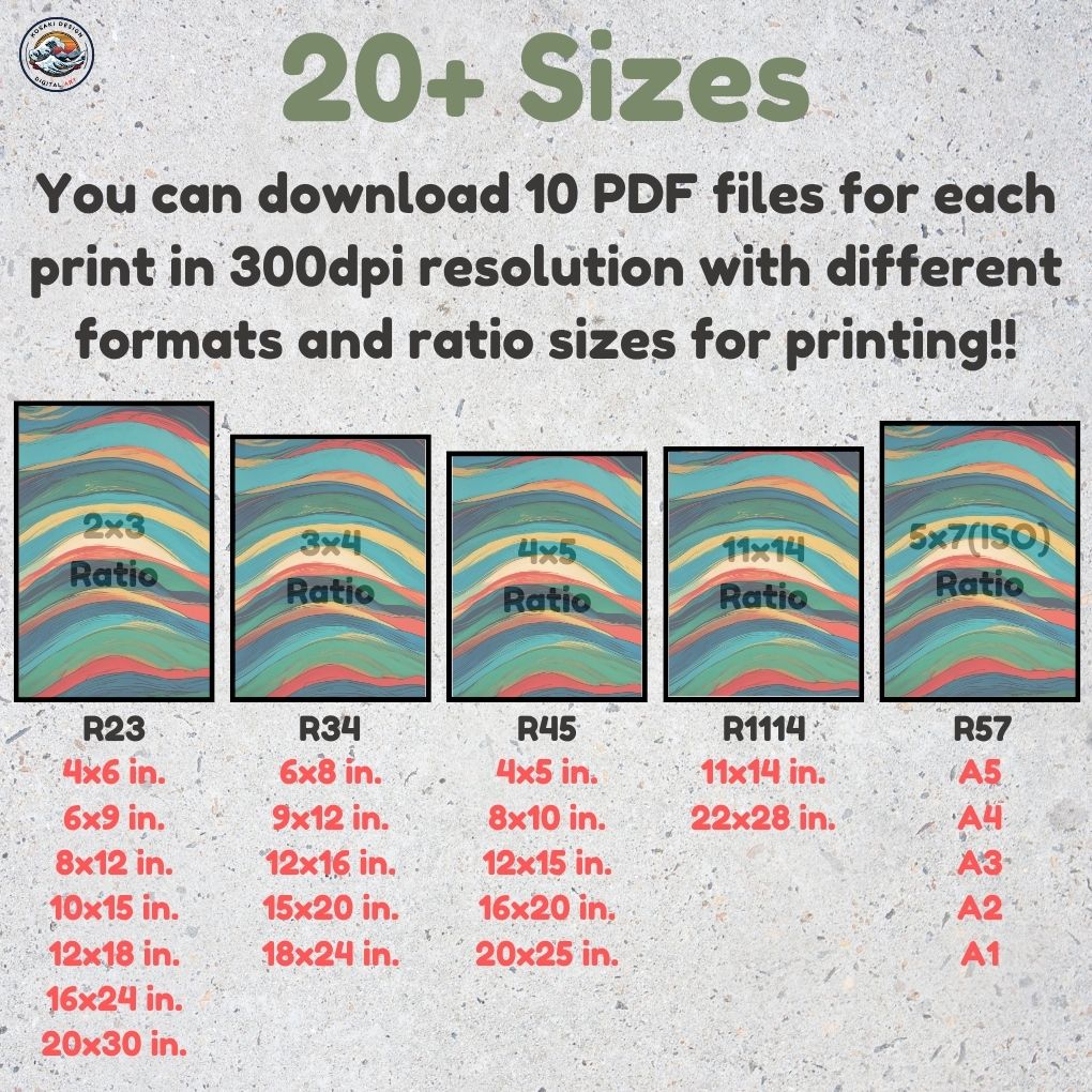 You'll get high-quality (300dpi) files that can be printed in over 20 different sizes. Here's a list of the included ratios and their corresponding print sizes. If you require a specific size or have any inquiries about sizes, printing, or any other matter, simply send us a message. We'll respond as soon as possible to help you.