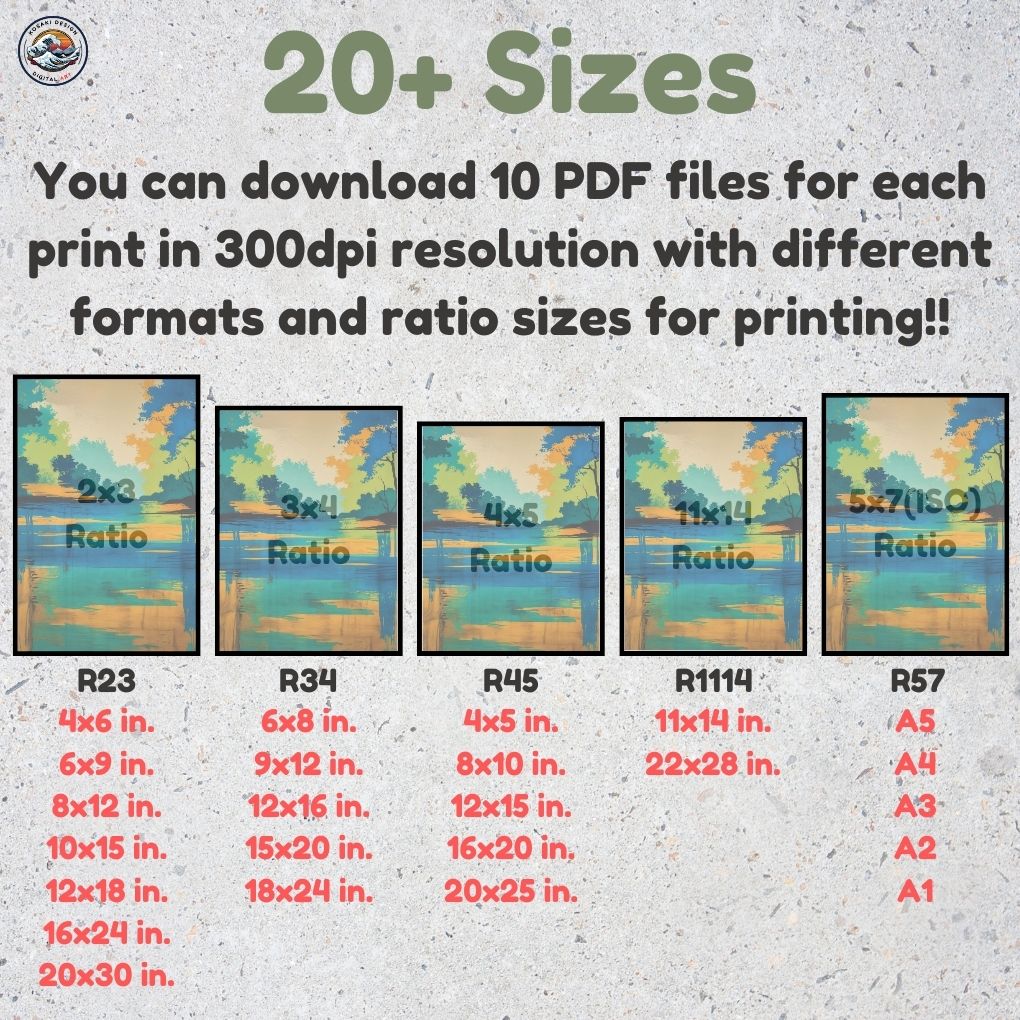 Your digital art journey begins with a single PDF! Inside, you'll find 10 direct links to download high-quality 300dpi PDF files of your artwork. Each file is a versatile resource, containing various aspect ratios that enable you to print your chosen piece in over 20 different dimensions.