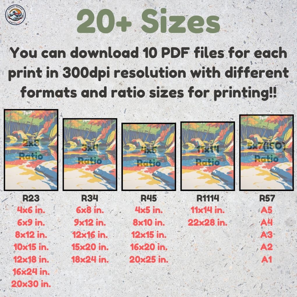 You'll get high-quality (300dpi) files that can be printed in over 20 different sizes. Here's a list of the included ratios and their corresponding print sizes. If you require a specific size or have any inquiries about sizes, printing, or any other matter, simply send us a message. We'll respond as soon as possible to help you.