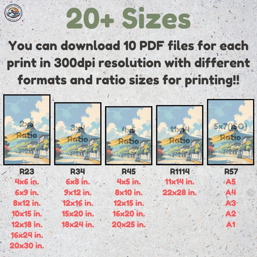 You'll get high-quality (300dpi) files that can be printed in over 20 different sizes. Here's a list of the included ratios and their corresponding print sizes. If you require a specific size or have any inquiries about sizes, printing, or any other matter, simply send us a message. We'll respond as soon as possible to help you.