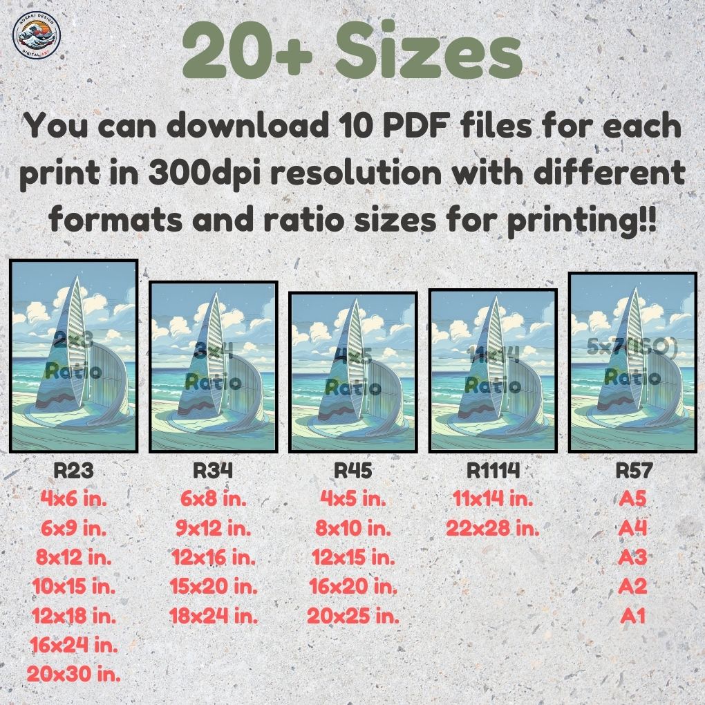 Your digital art journey begins with a single PDF! Inside, you'll find 10 direct links to download high-quality 300dpi PDF files of your artwork. Each file is a versatile resource, containing various aspect ratios that enable you to print your chosen piece in over 20 different dimensions.
