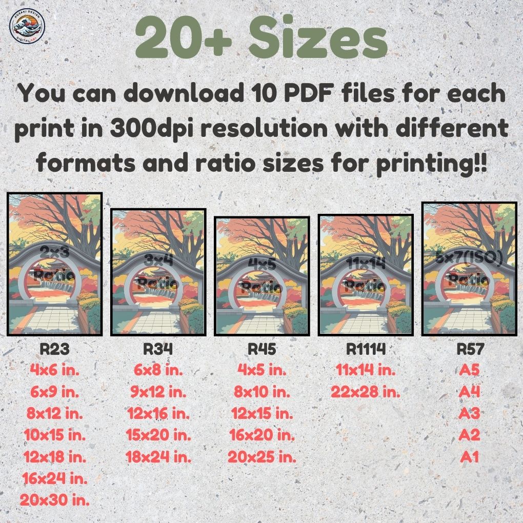 You'll get high-quality (300dpi) files that can be printed in over 20 different sizes. Here's a list of the included ratios and their corresponding print sizes. If you require a specific size or have any inquiries about sizes, printing, or any other matter, simply send us a message. We'll respond as soon as possible to help you.