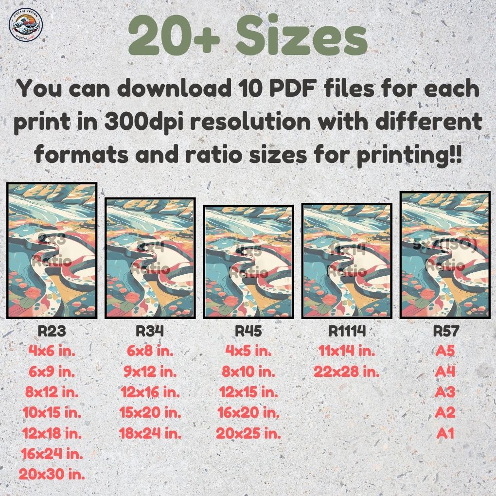 You'll get high-quality (300dpi) files that can be printed in over 20 different sizes. Here's a list of the included ratios and their corresponding print sizes. If you require a specific size or have any inquiries about sizes, printing, or any other matter, simply send us a message. We'll respond as soon as possible to help you.