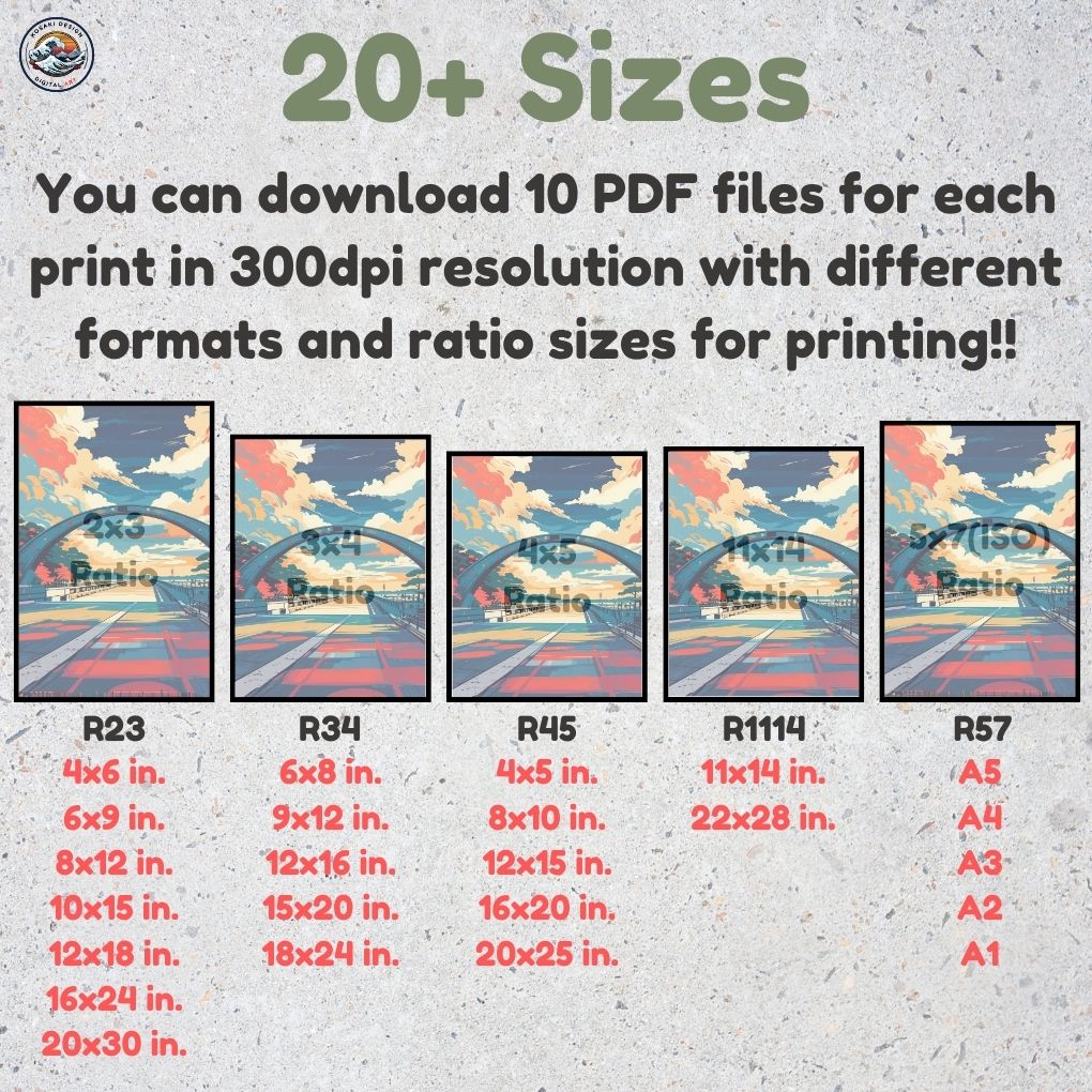 You'll get high-quality (300dpi) files that can be printed in over 20 different sizes. Here's a list of the included ratios and their corresponding print sizes. If you require a specific size or have any inquiries about sizes, printing, or any other matter, simply send us a message. We'll respond as soon as possible to help you.