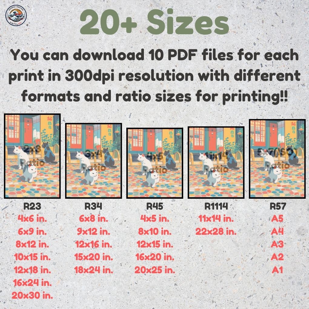 You'll get high-quality (300dpi) files that can be printed in over 20 different sizes. Here's a list of the included ratios and their corresponding print sizes. If you require a specific size or have any inquiries about sizes, printing, or any other matter, simply send us a message. We'll respond as soon as possible to help you.