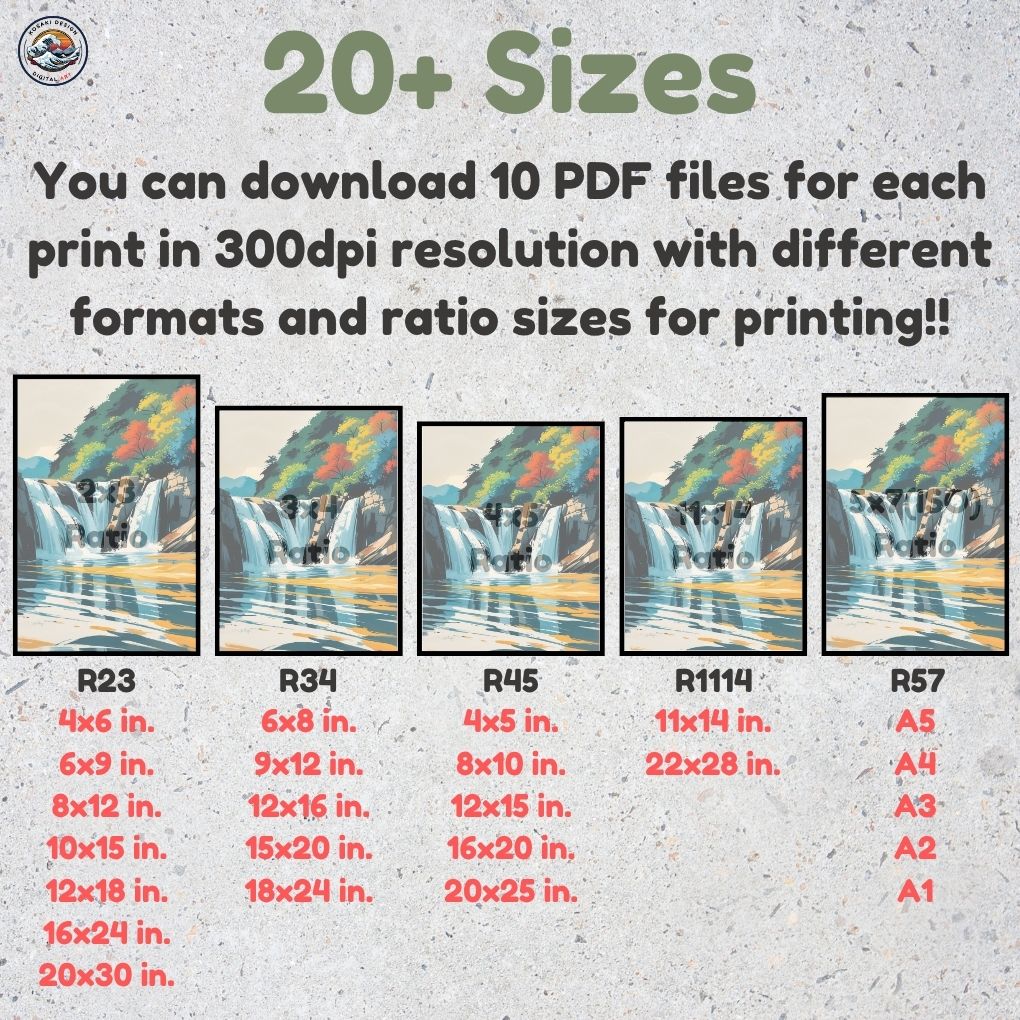 Your digital art journey begins with a single PDF! Inside, you'll find 10 direct links to download high-quality 300dpi PDF files of your artwork. Each file is a versatile resource, containing various aspect ratios that enable you to print your chosen piece in over 20 different dimensions.