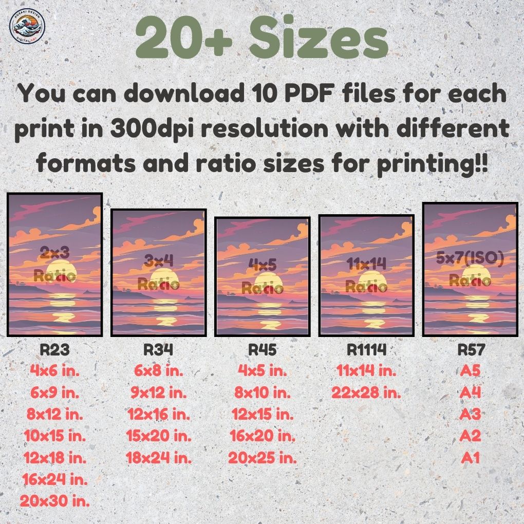 You'll get high-quality (300dpi) files that can be printed in over 20 different sizes. Here's a list of the included ratios and their corresponding print sizes. If you require a specific size or have any inquiries about sizes, printing, or any other matter, simply send us a message. We'll respond as soon as possible to help you.