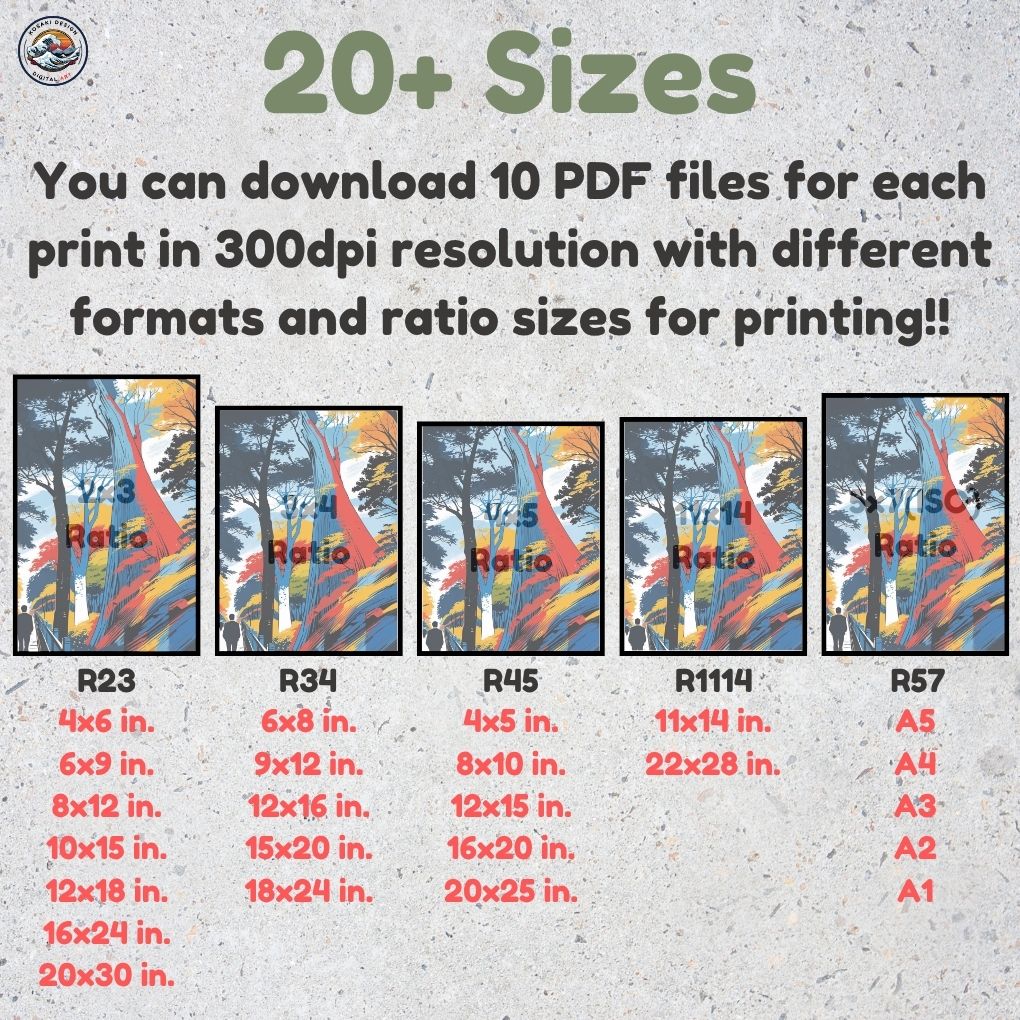 You'll get high-quality (300dpi) files that can be printed in over 20 different sizes. Here's a list of the included ratios and their corresponding print sizes. If you require a specific size or have any inquiries about sizes, printing, or any other matter, simply send us a message. We'll respond as soon as possible to help you.