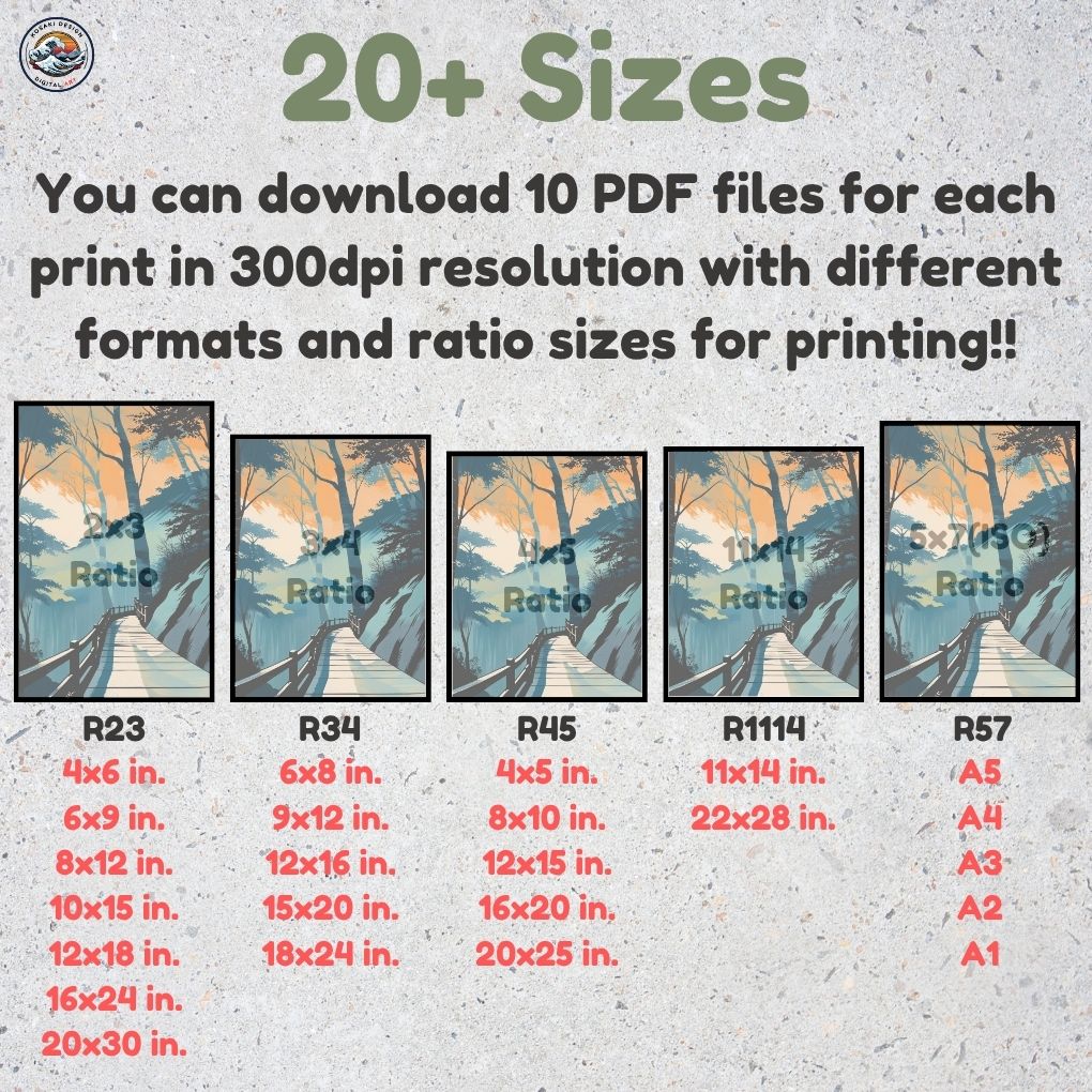 Your digital art journey begins with a single PDF! Inside, you'll find 10 direct links to download high-quality 300dpi PDF files of your artwork. Each file is a versatile resource, containing various aspect ratios that enable you to print your chosen piece in over 20 different dimensions.