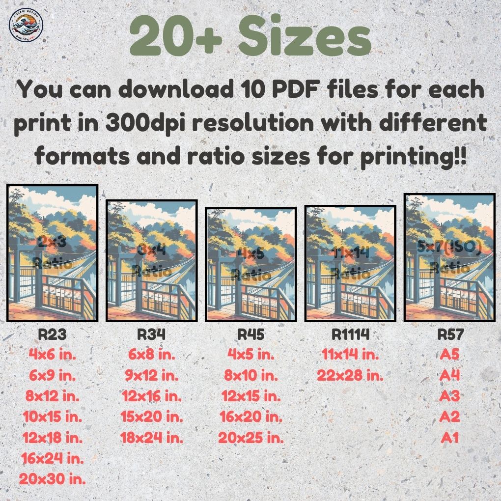 Your digital art journey begins with a single PDF! Inside, you'll find 10 direct links to download high-quality 300dpi PDF files of your artwork. Each file is a versatile resource, containing various aspect ratios that enable you to print your chosen piece in over 20 different dimensions.