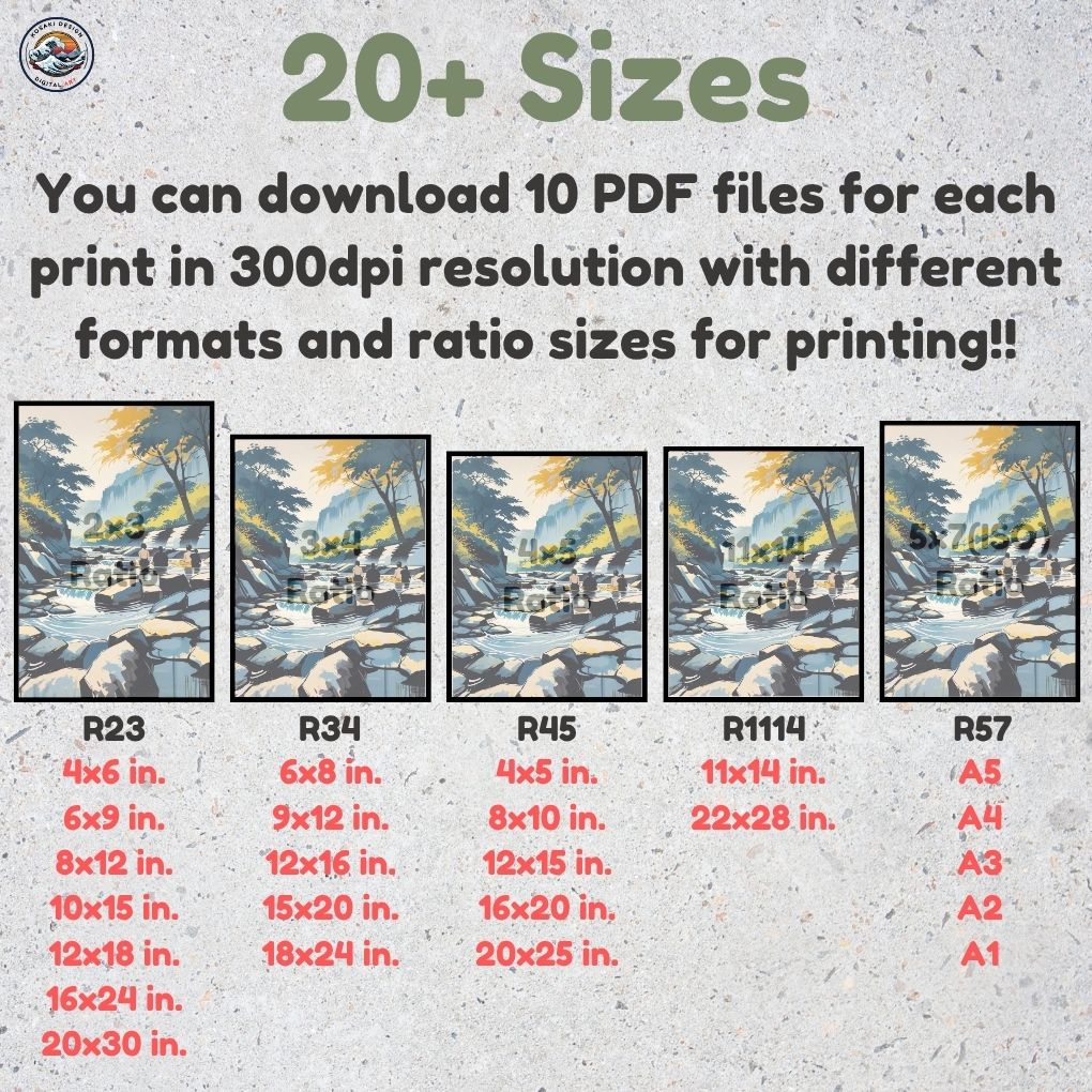 You'll get high-quality (300dpi) files that can be printed in over 20 different sizes. Here's a list of the included ratios and their corresponding print sizes. If you require a specific size or have any inquiries about sizes, printing, or any other matter, simply send us a message. We'll respond as soon as possible to help you.