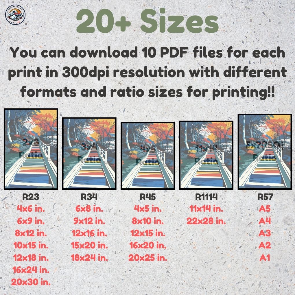 You'll get high-quality (300dpi) files that can be printed in over 20 different sizes. Here's a list of the included ratios and their corresponding print sizes. If you require a specific size or have any inquiries about sizes, printing, or any other matter, simply send us a message. We'll respond as soon as possible to help you.
