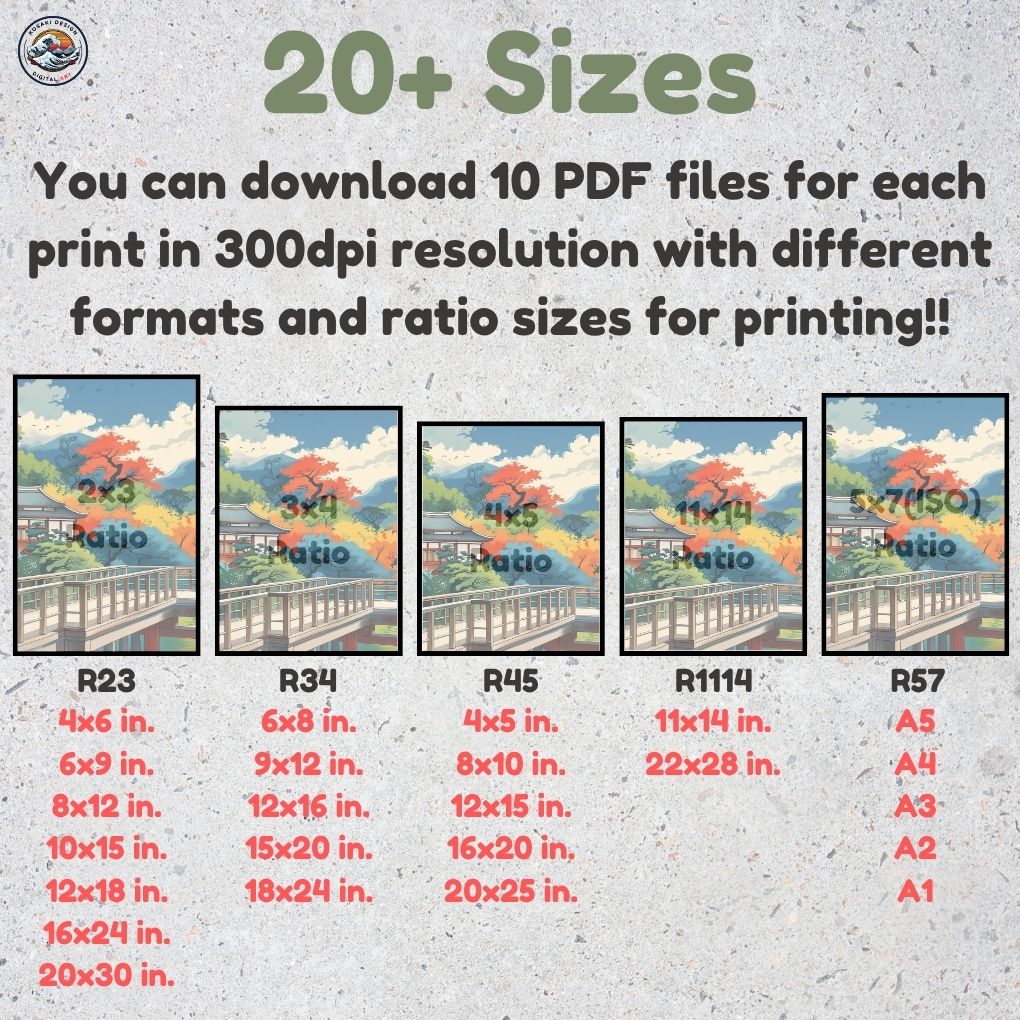 You'll get high-quality (300dpi) files that can be printed in over 20 different sizes. Here's a list of the included ratios and their corresponding print sizes. If you require a specific size or have any inquiries about sizes, printing, or any other matter, simply send us a message. We'll respond as soon as possible to help you.
