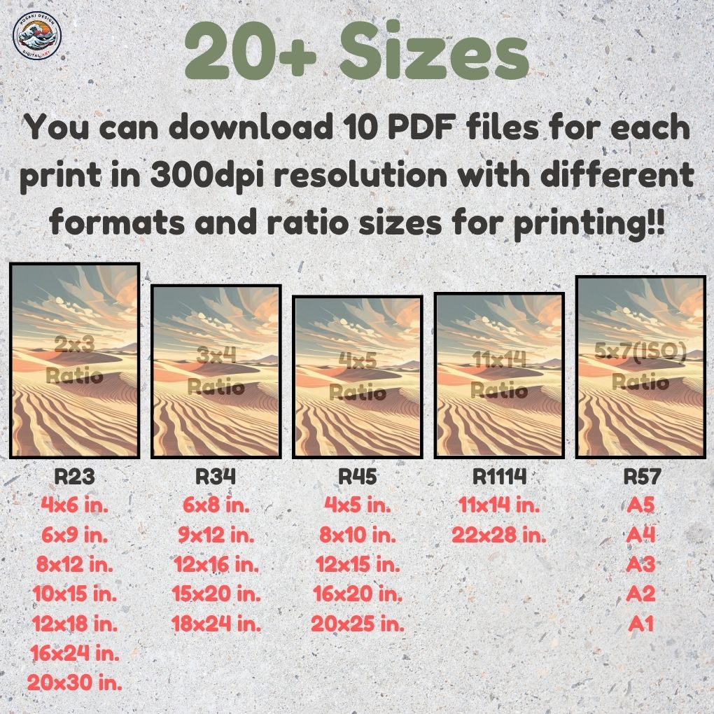 You'll get high-quality (300dpi) files that can be printed in over 20 different sizes. Here's a list of the included ratios and their corresponding print sizes. If you require a specific size or have any inquiries about sizes, printing, or any other matter, simply send us a message. We'll respond as soon as possible to help you.