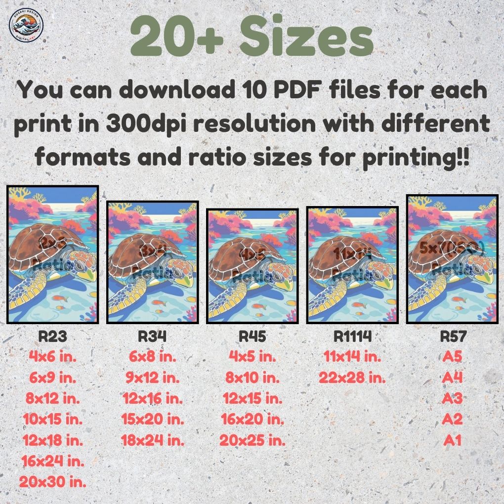You'll get high-quality (300dpi) files that can be printed in over 20 different sizes. Here's a list of the included ratios and their corresponding print sizes. If you require a specific size or have any inquiries about sizes, printing, or any other matter, simply send us a message. We'll respond as soon as possible to help you.