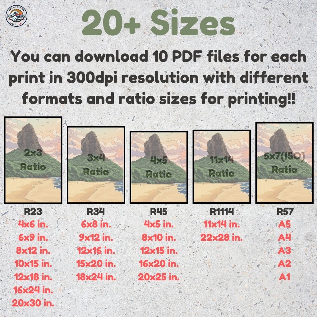 You'll get high-quality (300dpi) files that can be printed in over 20 different sizes. Here's a list of the included ratios and their corresponding print sizes. If you require a specific size or have any inquiries about sizes, printing, or any other matter, simply send us a message. We'll respond as soon as possible to help you.