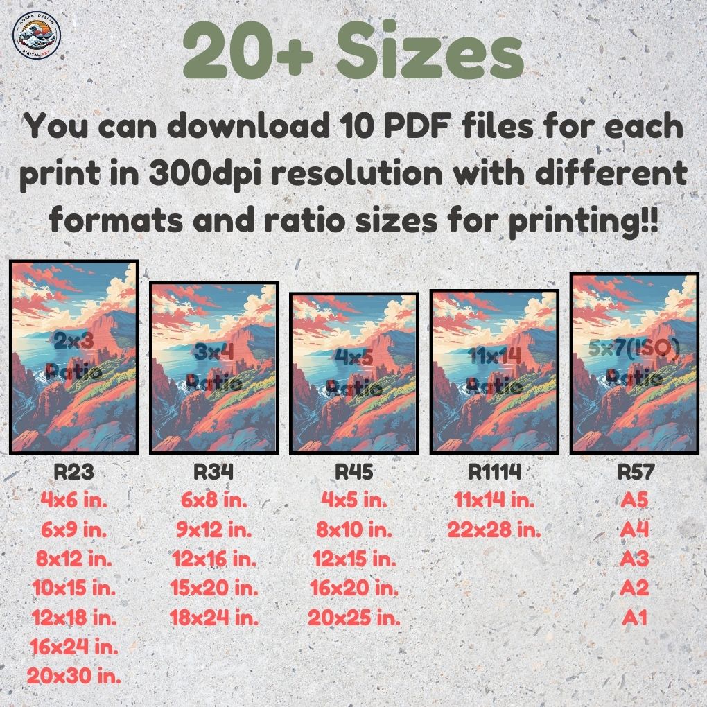 You'll get high-quality (300dpi) files that can be printed in over 20 different sizes. Here's a list of the included ratios and their corresponding print sizes. If you require a specific size or have any inquiries about sizes, printing, or any other matter, simply send us a message. We'll respond as soon as possible to help you.