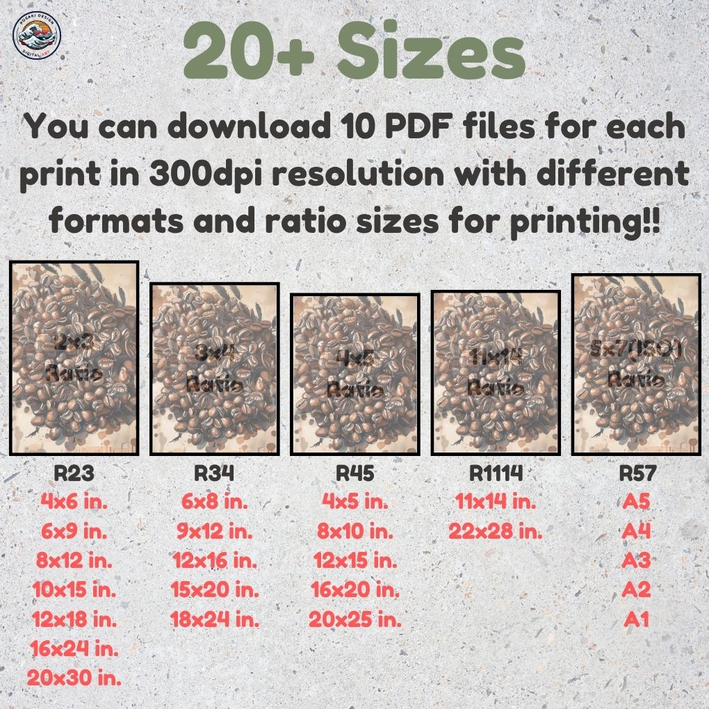 You'll get high-quality (300dpi) files that can be printed in over 20 different sizes. Here's a list of the included ratios and their corresponding print sizes. If you require a specific size or have any inquiries about sizes, printing, or any other matter, simply send us a message. We'll respond as soon as possible to help you.