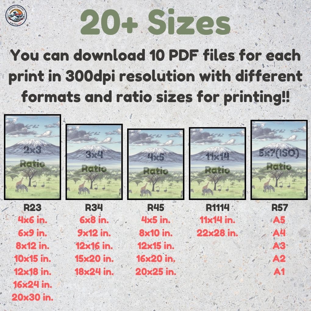You'll get high-quality (300dpi) files that can be printed in over 20 different sizes. Here's a list of the included ratios and their corresponding print sizes. If you require a specific size or have any inquiries about sizes, printing, or any other matter, simply send us a message. We'll respond as soon as possible to help you.