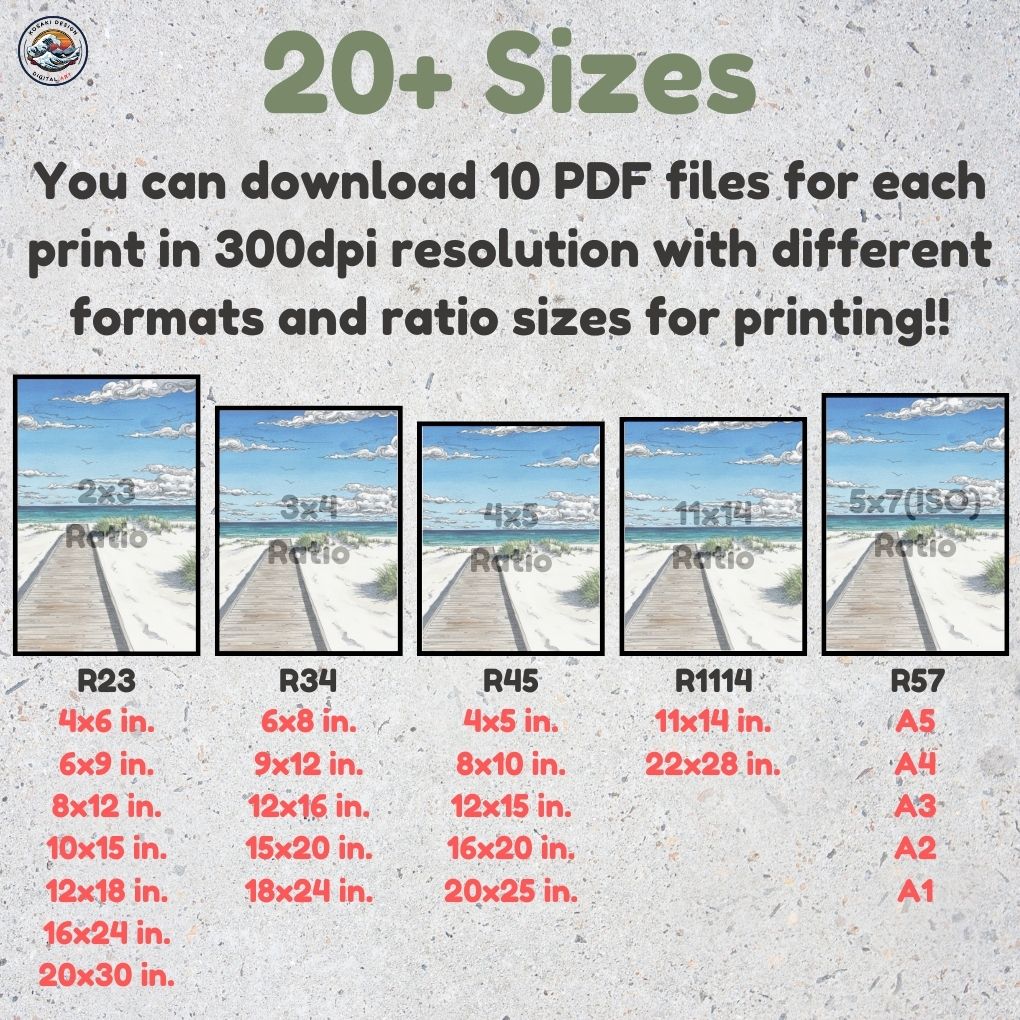 You'll get high-quality (300dpi) files that can be printed in over 20 different sizes. Here's a list of the included ratios and their corresponding print sizes. If you require a specific size or have any inquiries about sizes, printing, or any other matter, simply send us a message. We'll respond as soon as possible to help you.