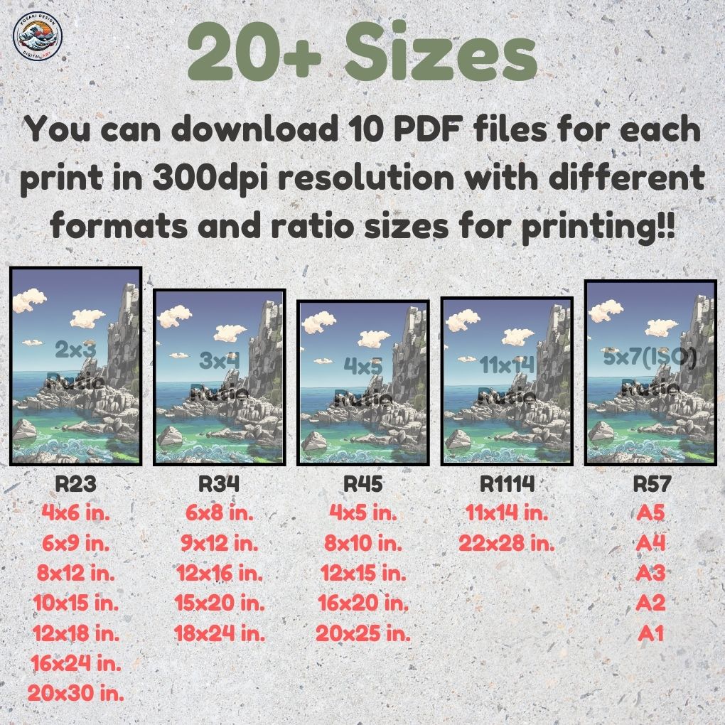 You'll get high-quality (300dpi) files that can be printed in over 20 different sizes. Here's a list of the included ratios and their corresponding print sizes. If you require a specific size or have any inquiries about sizes, printing, or any other matter, simply send us a message. We'll respond as soon as possible to help you.